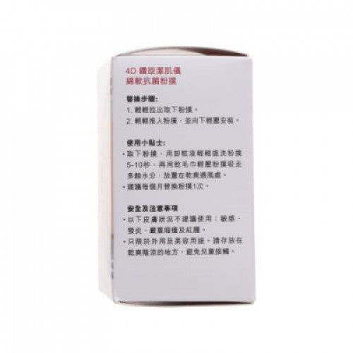 4D 鑽旋潔肌儀棉軟抗菌粉撲能輕鬆解決妝容不持久的問題,令女仕無需再為補妝問題而擔心。需配合4D鑽旋潔肌儀使用,上妝同時按摩,使妝容均勻,亦令肌膚在上妝的同時得到呵護,遠比普通化妝棉或化妝掃更能把妝容上得均勻。除了有效提升肌膚和收緊面部輪廓,更符合全面抗菌功能,使肌膚在最好的狀態下配襯您最完美的妝容。